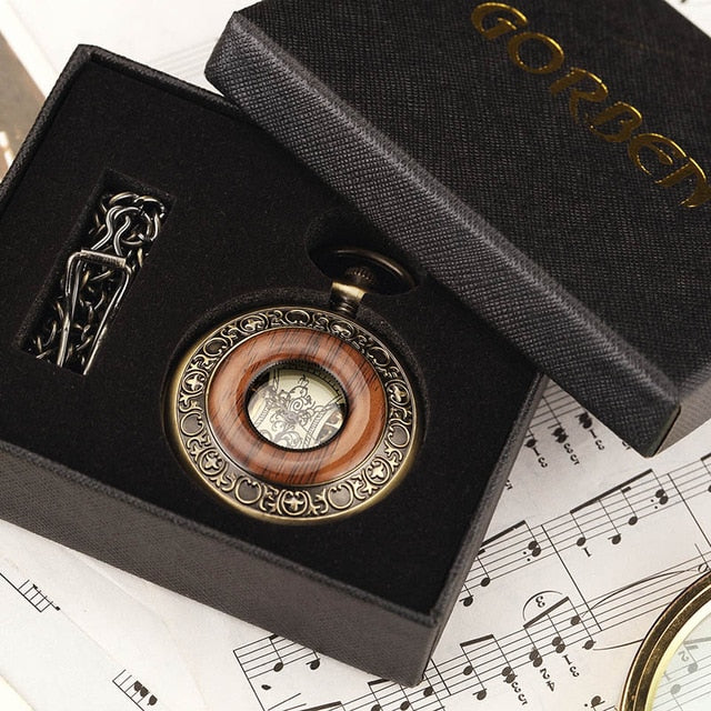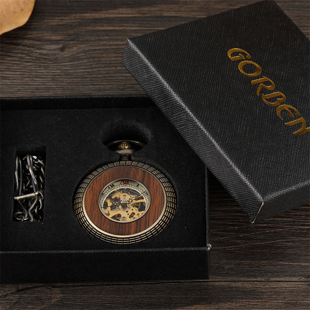 Box Package Solid Wood Mechanical Pocket Watch FOB Chain Locket Dial Hollow Steampunk Skeleton Men Women Mens Male Clock Watches