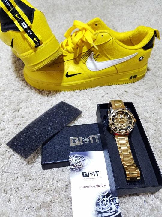 Golden Classic Rhinestone Roman Analog Skeleton Automatic Mechanical Men's Watch